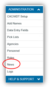 Click on the “Administration” dropdown arrow on the left-hand side menu in NCAtrak and select “News.”
