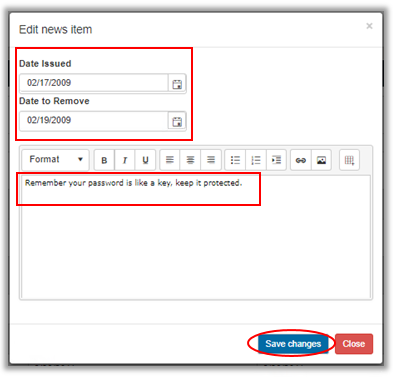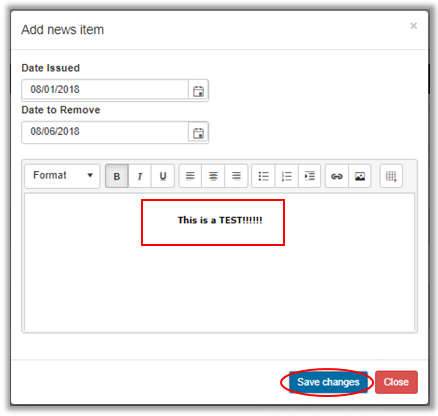 Click on the “Save changes” button to save your news item or “Close” if you do not want to save it.