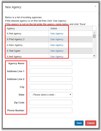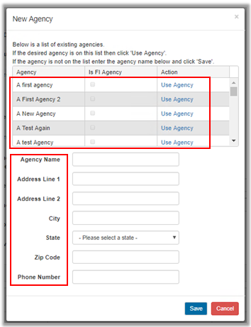 Click “Save” to add the new agency or “Cancel” to forego adding a new agency.