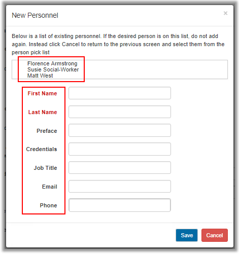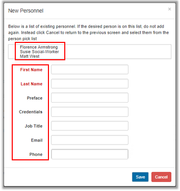 A “New Personnel” dialog box will appear with a list of existing individuals associated with the agency. Check to make sure the person you want to add is not in the list. If they are on the list, click cancel to return to the Referral section and select them from the Person dropdown box. If the individual does not appear in the list, enter the individual’s name, credentials, job title, email address and phone number, if known. First and last names are required. Click “Save” to add the new person or “Cancel” to forego adding a new person.