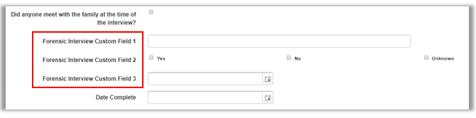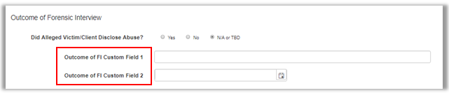 Enter information into any custom fields your CAC has added to the Forensic Interview section.