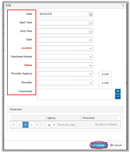 Click “Update” to save the observer to the record. Click “Cancel” to forego adding an observer.