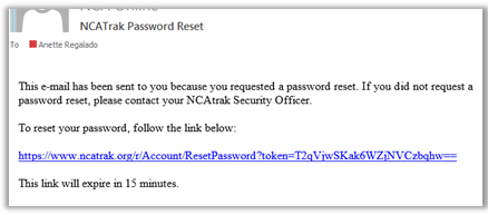 user’s NCAtrak profile or the password reset email is received but after clicking on the link to reset the password, an error is displayed.
