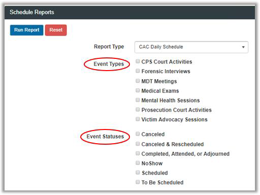 Figure 3. “Event Types” and “Event Statuses” check boxes
