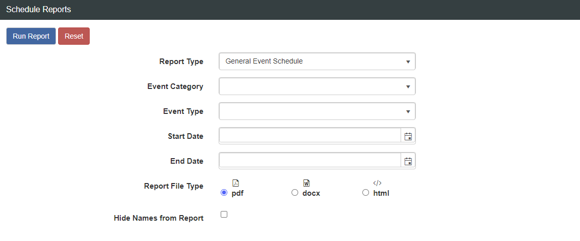 Note: There is an option to hide names from the report. The names that are hidden are the attendees or staff members who were assigned to the event.