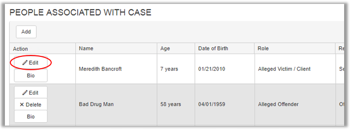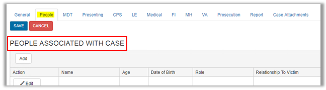 • People Associated with the Case Table: a list of the people associated with the case and their