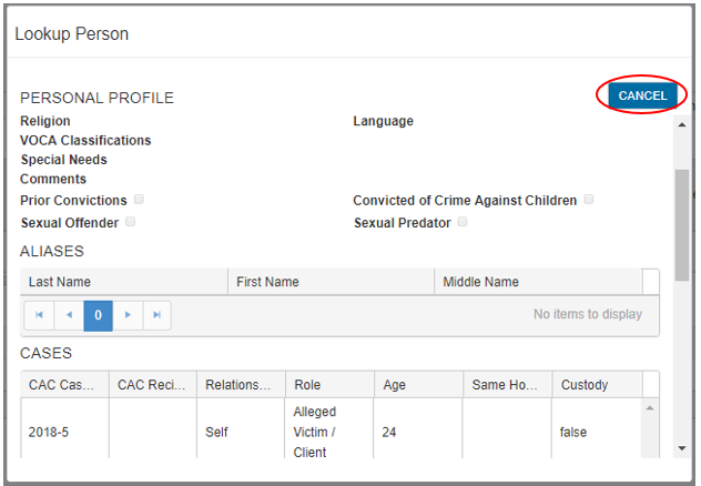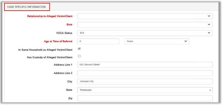Case Specific Information | Relationship to the Alleged Victim/Client | Displays the relationship of this person to the Alleged Victim/Client on this case and is a required field. |