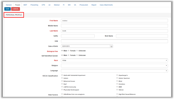 Personal Profile | Date of Birth, Unknown Date of Birth, Date of Death | Use the calendar tool or enter the date in the MM/DD/YYYY format. If you enter the Date of Birth, the Age at time of Referral (in the case specific information section) will automatically update based on the date the case was received by the CAC. If you don’t know the DOB but you do want to enter an Age, you can do so in the Case Specific Information section. If the DOB is unknown check the field and if there is a date of death enter the date in the provided field. |