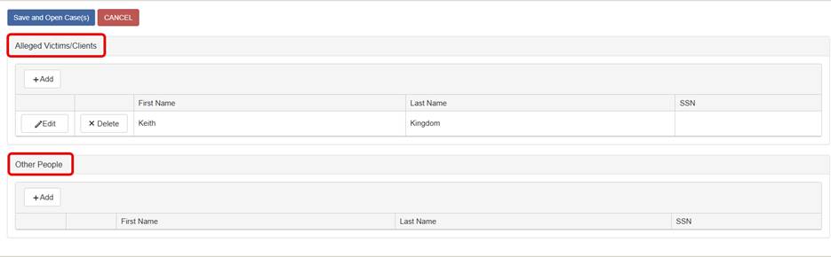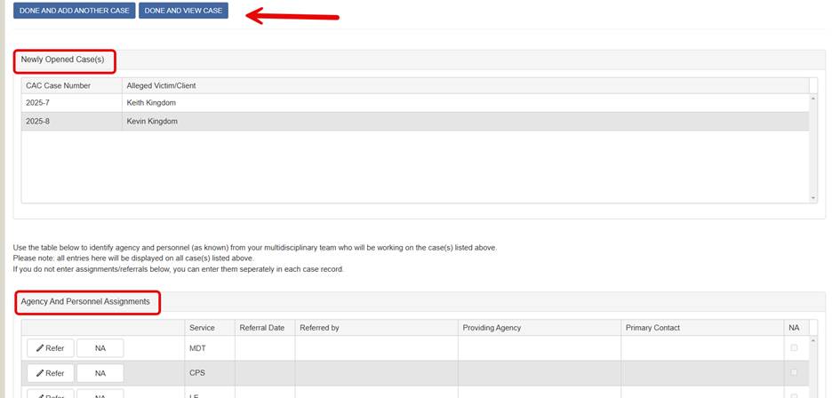 Step 9: After clicking Save and Open Case it will show the Newly Opened Case(s) with the CAC Case Number(s) assigned. These Alleged Victim/Clients have an individual case number to track services and will be linked on each other’s General Tab and additionally Co-victims on each other’s case if appropriate. The next section is Agency And Personnel Assignments where you can add service referrals that will be added to each case’s General Tab Case Tracking Chart.